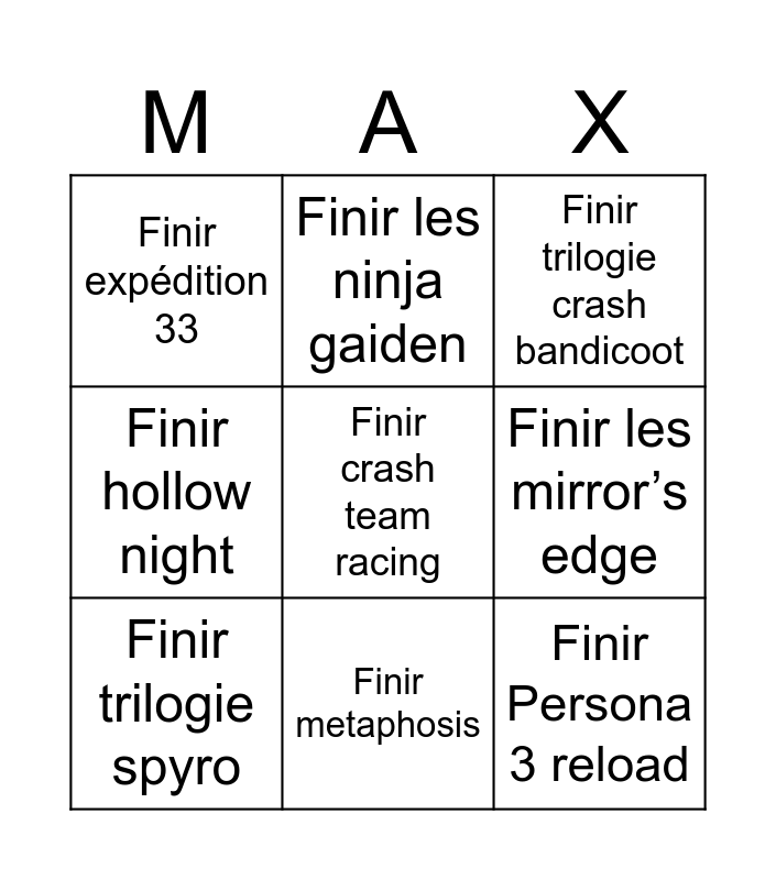 This bingo card has a free space and 8 words: Finir hollow night, Finir les ninja gaiden, Finir les mirror’s edge, Finir trilogie spyro, Finir trilogie crash bandicoot, Finir expédition 33, Finir metaphosis and Finir Persona 3 reload.