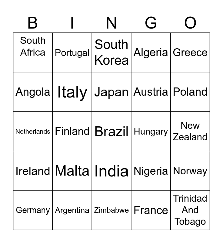 This bingo card has a free space and 34 words: Spain, France, Denmark, United Kingdom, Ireland, Italy, Greece, Germany, Portugal, Canada, Japan, South Korea, Mexico, Australia, Hungary, Poland, Argentina, Netherlands, Malta, Nigeria, India, China, South Africa, New Zealand, Zimbabwe, Trinidad And Tobago, Algeria, Belgium, Austria, Angola, Egypt, Finland, Norway and Philippines.