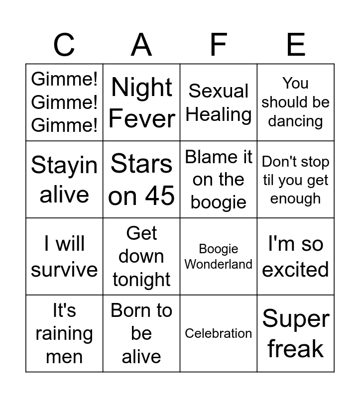 This bingo card has 41 words: Free!, Boogie Wonderland, Le Freak, Blame it on the boogie, Let's Groove, September, Don't stop til you get enough, Get down on it, Stayin alive, Super freak, I'm so excited, You should be dancing, It's raining men, Celebration, Born to be alive, Dancing Queen, Funky Town, Gimme! Gimme! Gimme!, Pump up the jam, Sexual Healing, I wanna dance with somebody, Ladies Night, Can't take my eyes off of you, I will survive, Fresh, That's the way i like it, Give me the night, Disco Inferno, Get down tonight, Yes sir, i can boogie, Raspberry Beret, Night Fever, Car Wash, Rasputin, Jump (for my love), Stars on 45, Relight my fire, Pick up the pieces, Fame, Hot stuff and Ma baker.