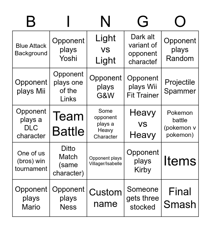 This bingo card has a free space and 24 words: Ditto Match (same character), Opponent plays Ness, Opponent plays G&W, Opponent plays Mario, Opponent plays Random, Blue Attack Background, Opponent plays Mii, Opponent plays Yoshi, Heavy vs Heavy, Opponent plays Villager/Isabelle, Opponent plays Wii Fit Trainer, Opponent plays a DLC character, Opponent plays Kirby, Items, Opponent plays one of the Links, Someone gets three stocked, Pokemon battle (pokemon v pokemon), Light vs Light, Projectile Spammer, Team Battle, Final Smash, One of us (bros) win tournament, Dark alt variant of opponent charactef and Custom name.