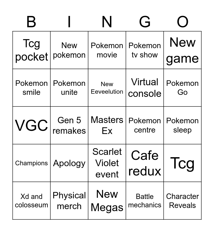 This bingo card has a free space and 24 words: Xd and colosseum, Apology, New Eeveelution, Battle mechanics, New game, Tcg pocket, New pokemon, Pokemon movie, Pokemon centre, Pokemon sleep, VGC, Pokemon unite, Cafe redux, Tcg, Pokemon smile, Physical merch, New Megas, Pokemon tv show, Pokemon Go, Champions, Gen 5 remakes, Scarlet Violet event, Virtual console and Character Reveals.