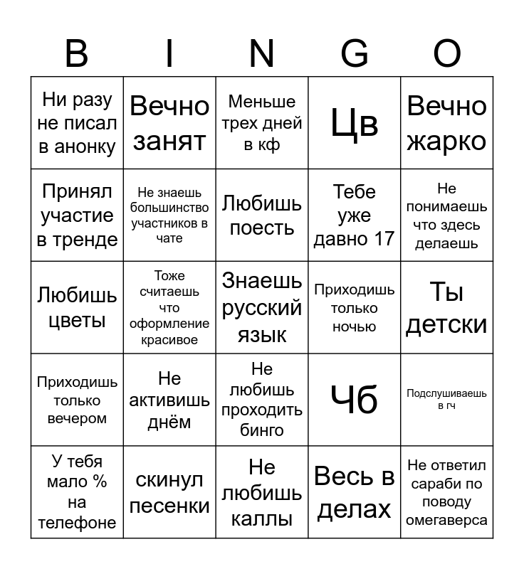 This bingo card has a free space and 24 words: Не активишь днём, скинул песенки, Любишь поесть, У тебя мало % на телефоне, Вечно жарко, Ни разу не писал в анонку, Принял участие в тренде, Вечно занят, Приходишь только ночью, Не любишь проходить бинго, Тебе уже давно 17, Любишь цветы, Чб, Подслушиваешь в гч, Не знаешь большинство участников в чате, Весь в делах, Ты детски, Меньше трех дней в кф, Не понимаешь что здесь делаешь, Тоже считаешь что оформление красивое, Не ответил сараби по поводу омегаверса, Приходишь только вечером, Цв and Не любишь каллы.
