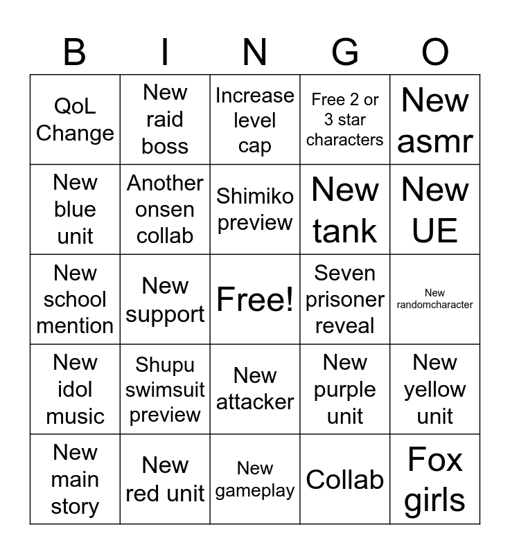 This bingo card has a free space and 24 words: New main story, Shupu swimsuit preview, Shimiko preview, Collab, New asmr, QoL Change, New raid boss, Increase level cap, Seven prisoner reveal, New randomcharacter, New school mention, Another onsen collab, New purple unit, New yellow unit, New blue unit, New red unit, New gameplay, Free 2 or 3 star characters, New UE, New idol music, New support, New attacker, New tank and Fox girls.