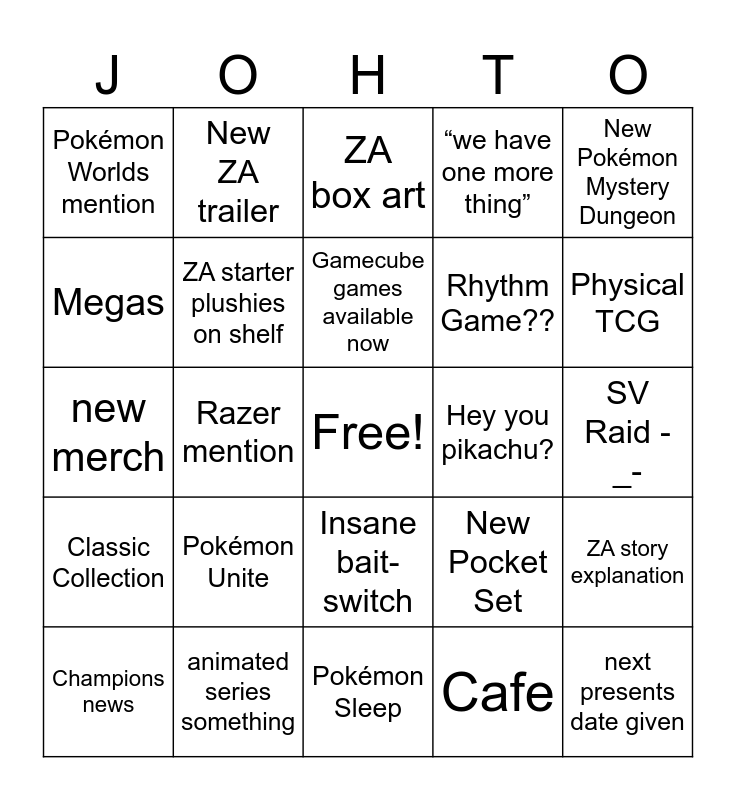 This bingo card has a free space and 24 words: Pokémon Unite, animated series something, Gamecube games available now, Champions news, New Pokémon Mystery Dungeon, Pokémon Worlds mention, Megas, New ZA trailer, Hey you pikachu?, Insane bait-switch, Rhythm Game??, new merch, New Pocket Set, ZA story explanation, ZA starter plushies on shelf, Cafe, SV Raid -_-, ZA box art, Physical TCG, Razer mention, next presents date given, Classic Collection, “we have one more thing” and Pokémon Sleep.