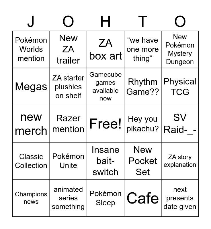 This bingo card has a free space and 24 words: Pokémon Unite, animated series something, Gamecube games available now, Champions news, New Pokémon Mystery Dungeon, Pokémon Worlds mention, Megas, New ZA trailer, Hey you pikachu?, Insane bait-switch, Rhythm Game??, new merch, New Pocket Set, ZA story explanation, ZA starter plushies on shelf, Cafe, SV Raid-_-, ZA box art, Physical TCG, Razer mention, next presents date given, Classic Collection, “we have one more thing” and Pokémon Sleep.