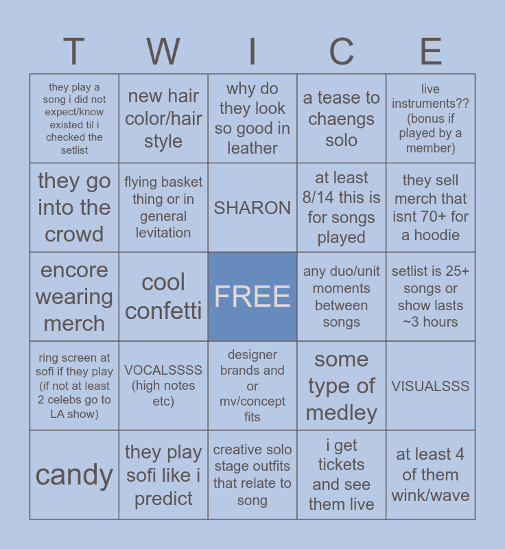 This bingo card has a free space and 24 words: VOCALSSSS (high notes etc), they play sofi like i predict, SHARON, candy, live instruments?? (bonus if played by a member), they play a song i did not expect/know existed til i checked the setlist, they go into the crowd, new hair color/hair style, any duo/unit moments between songs, designer brands and or mv/concept fits, at least 8/14 this is for songs played, encore wearing merch, some type of medley, VISUALSSS, flying basket thing or in general levitation, i get tickets and see them live, setlist is 25+ songs or show lasts ~3 hours, why do they look so good in leather, they sell merch that isnt 70+ for a hoodie, cool confetti, at least 4 of them wink/wave, ring screen at sofi if they play (if not at least 2 celebs go to LA show), a tease to chaengs solo and creative solo stage outfits that relate to song.