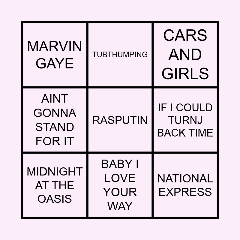 This bingo card has 24 words: CRAZY FROG, SOMEWHERE IN MY HEART, BABY I LOVE YOUR WAY, UPTOWN GIRL, RASPUTIN, MARVIN GAYE, IF I COULD TURNJ BACK TIME, TUBTHUMPING, LIFE AIN'T EASY, BREATHLESS, NATIONAL EXPRESS, SUMMER IN THE CITY, LADY ELANORE, YOUNG BOY, MIDNIGHT AT THE OASIS, LIVE N DIE, CHERISH, CARS AND GIRLS, SMOOTH, FOREVER YOUNG, SUGAR BABY LOVE, TO THE MOON AND BACK, AINT GONNA STAND FOR IT and HANDLE WITH CARE.