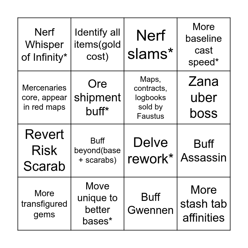 This bingo card has 16 words: Move unique to better bases*, Buff Assassin, Nerf slams*, Nerf Whisper of Infinity*, Revert Risk Scarab, Identify all items(gold cost), Delve rework*, Buff Gwennen, Mercenaries core, appear in red maps, Ore shipment buff*, More transfigured gems, More baseline cast speed*, Buff beyond(base + scarabs), Zana uber boss, Maps, contracts, logbooks sold by Faustus and More stash tab affinities.