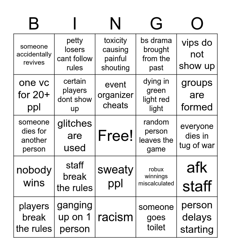 This bingo card has a free space and 24 words: players break the rules, staff break the rules, event organizer cheats, someone goes toilet, vips do not show up, someone accidentally revives, petty losers cant follow rules, toxicity causing painful shouting, random person leaves the game, everyone dies in tug of war, someone dies for another person, certain players dont show up, robux winnings miscalculated, afk staff, one vc for 20+ ppl, ganging up on 1 person, racism, bs drama brought from the past, groups are formed, nobody wins, glitches are used, sweaty ppl, dying in green light red light and person delays starting.