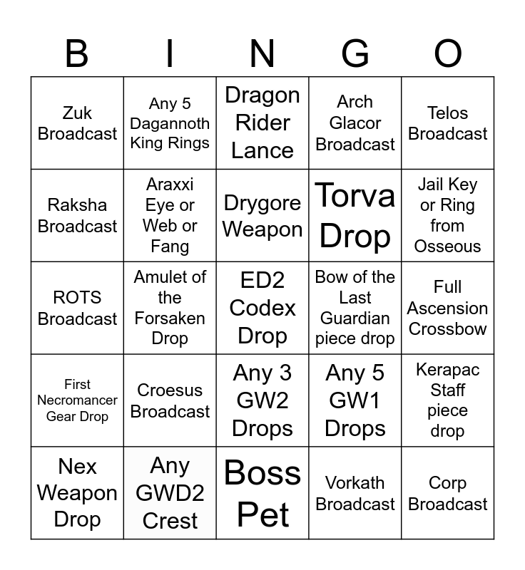 This bingo card has 25 words: First Necromancer Gear Drop, Any GWD2 Crest, ED2 Codex Drop, Vorkath Broadcast, Telos Broadcast, Zuk Broadcast, Any 5 Dagannoth King Rings, Dragon Rider Lance, Bow of the Last Guardian piece drop, Kerapac Staff piece drop, Raksha Broadcast, Araxxi Eye or Web or Fang, Boss Pet, Any 5 GW1 Drops, Jail Key or Ring from Osseous, Nex Weapon Drop, Amulet of the Forsaken Drop, Drygore Weapon, Torva Drop, Full Ascension Crossbow, ROTS Broadcast, Croesus Broadcast, Any 3 GW2 Drops, Arch Glacor Broadcast and Corp Broadcast.