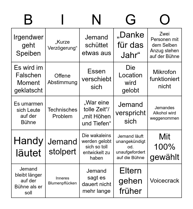 This bingo card has a free space and 29 words: Jemand bleibt länger auf der Bühne als er soll, Jemand weint auf der Bühne, Technisches Problem, PowerPoint passt nicht zum To Punkt, Irgendwer geht Speiben, Jemand schüttet etwas aus, Offene Abstimmung, Jemand stolpert, Jemand verspricht sich, Inneres Blumenpflücken, Jemandes Alkohol wird weggenommen, Voicecrack, Jemand sagt es dauert nicht mehr lange, Eltern gehen früher, Mikrofon funktioniert nicht, Danke Mama und Papa, Die wakaleins werden gelobt sich so toll entwickelt zu haben, Handy läutet, Zwei Personen mit dem Selben Anzug stehen auf der Bühne, Es umarmen sich Leute auf der Bühne, Jemand läuft unangekündigt od. unaufgefordert auf die Bühne, Auftrittsmusik unterbricht Moderation, Die Location wird gelobt, Es wird im Falschen Moment geklatscht, „Danke für das Jahr“, „Kurze Verzögerung“, Mit 100% gewählt, Essen verschiebt sich and „Bitte pünktlich wieder da sein“.