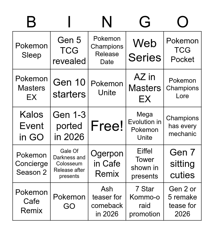 This bingo card has a free space and 24 words: Gale Of Darkness and Colosseum Release after presents, Pokemon GO, Pokemon Unite, Pokemon Cafe Remix, Pokemon TCG Pocket, Pokemon Sleep, Pokemon Masters EX, Gen 5 TCG revealed, Mega Evolution in Pokemon Unite, Ogerpon in Cafe Remix, AZ in Masters EX, Kalos Event in GO, Eiffel Tower shown in presents, Gen 7 sitting cuties, Gen 10 starters, 7 Star Kommo-o raid promotion, Champions has every mechanic, Pokemon Champions Release Date, Pokemon Champions Lore, Gen 1-3 ported in 2026, Gen 2 or 5 remake tease for 2026, Pokemon Concierge Season 2, Web Series and Ash teaser for comeback in 2026.