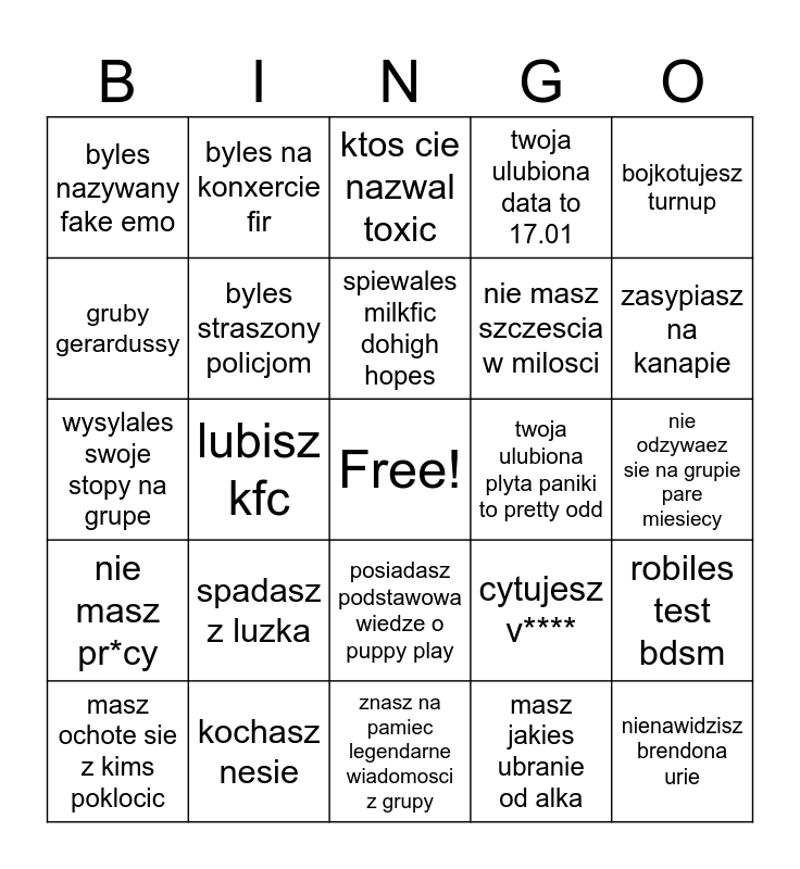 This bingo card has a free space and 24 words: spadasz z luzka, kochasz nesie, spiewales milkfic dohigh hopes, masz ochote sie z kims poklocic, bojkotujesz turnup, byles nazywany fake emo, gruby gerardussy, byles na konxercie fir, twoja ulubiona plyta paniki to pretty odd, posiadasz podstawowa wiedze o puppy play, nie masz szczescia w milosci, wysylales swoje stopy na grupe, cytujesz v****, robiles test bdsm, byles straszony policjom, masz jakies ubranie od alka, nie odzywaez sie na grupie pare miesiecy, ktos cie nazwal toxic, zasypiasz na kanapie, lubisz kfc, nienawidzisz brendona urie, nie masz pr*cy, twoja ulubiona data to 17.01 and znasz na pamiec legendarne wiadomosci z grupy.