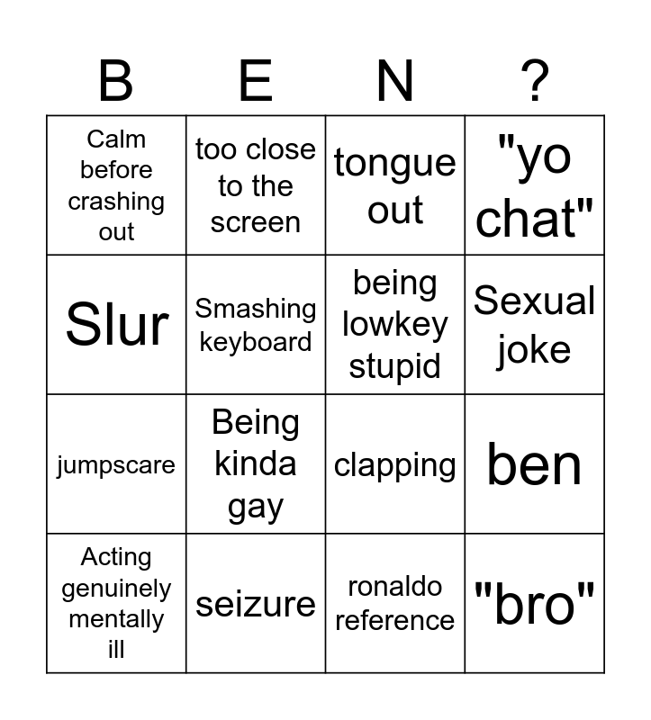 This bingo card has 16 words: seizure, ben, tongue out, Calm before crashing out, jumpscare, too close to the screen, clapping, ronaldo reference, Slur, Smashing keyboard, Acting genuinely mentally ill, "yo chat", Being kinda gay, Sexual joke, being lowkey stupid and "bro".