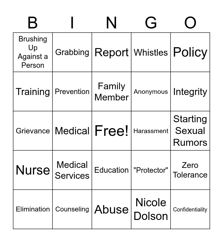 This bingo card has a free space and 44 words: Ombudsman, Confidentiality, Touching, Elimination, False Allegations, Nicole Dolson, Report, Victim, Policy, Counseling, Whistles, Harassment, Education, Medical Services, Comments, Abuse, PREA, Grievance, Gestures, Integrity, Grabbing, Assault, Sick Call Slip, Brushing Up Against a Person, Safety, Starting Sexual Rumors, Calling Out Dirty Names, Investigation, "Protector", Nurse, Officer, Zero Tolerance, Passing Sexual Notes/ Pictures, Assistance, Medical, Intervention, Parent, Guardian, Family Member, Training, Anonymous, Evidence, Prevention and YTC.