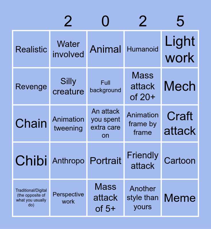 This bingo card has a free space and 24 words: Anthropo, Perspective work, Full background, Traditional/Digital (the opposite of what you usually do), Light work, Realistic, Revenge, Water involved, Animation frame by frame, Portrait, Mass attack of 20+, Chain, Friendly attack, Cartoon, Silly creature, Another style than yours, Craft attack, Animal, Mech, Animation tweening, Meme, Chibi, Humanoid and Mass attack of 5+.