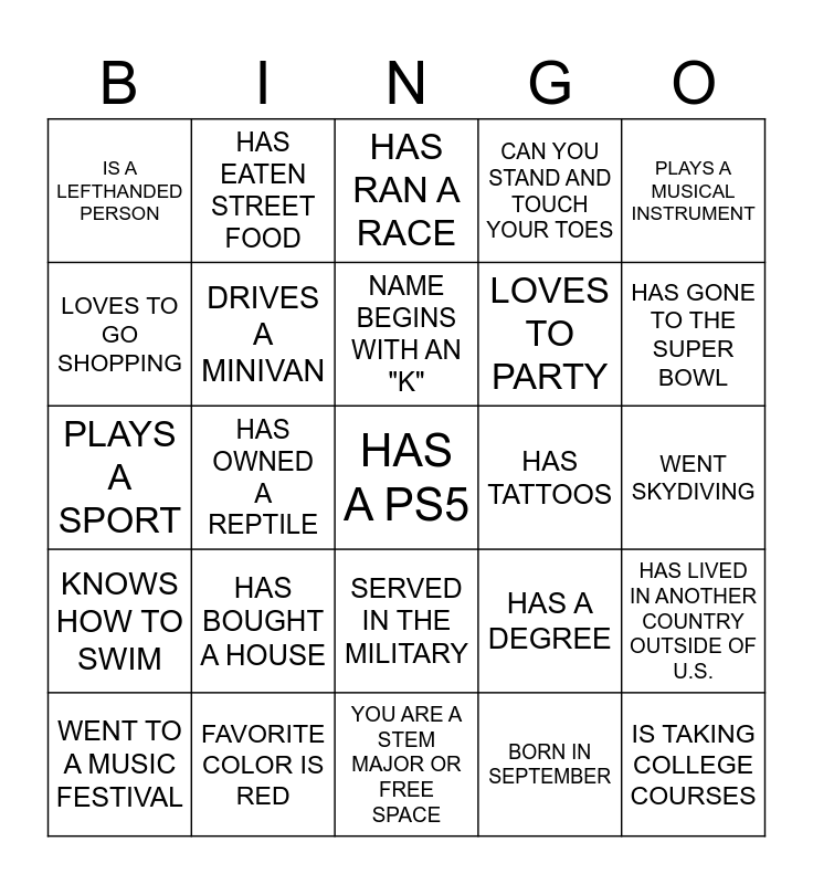 This bingo card has 25 words: KNOWS HOW TO SWIM, FAVORITE COLOR IS RED, HAS A PS5, BORN IN SEPTEMBER, PLAYS A MUSICAL INSTRUMENT, IS A LEFTHANDED PERSON, HAS EATEN STREET FOOD, HAS RAN A RACE, HAS TATTOOS, HAS LIVED IN ANOTHER COUNTRY OUTSIDE OF U.S., LOVES TO GO SHOPPING, DRIVES A MINIVAN, YOU ARE A STEM MAJOR OR FREE SPACE, HAS A DEGREE, HAS GONE TO THE SUPER BOWL, WENT TO A MUSIC FESTIVAL, HAS OWNED A REPTILE, NAME BEGINS WITH AN "K", LOVES TO PARTY, WENT SKYDIVING, PLAYS A SPORT, HAS BOUGHT A HOUSE, SERVED IN THE MILITARY, CAN YOU STAND AND TOUCH YOUR TOES and IS TAKING COLLEGE COURSES.