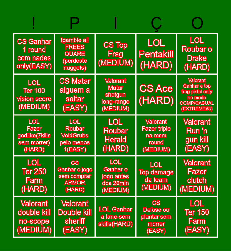 This bingo card has 55 words: Valorant Knife KILL (HARD), Valorant double kill no-scope (MEDIUM), Valorant TOP FRAG (MEDIUM), CS Ganhar 1 round com nades only(EASY), LOL Ganhar a lane sem skills(HARD), LOL Vencer um jogo só starter items(HARD), CS Matar alguem a saltar (EASY), Valorant Ganhar sem crossair (MEDIUM), CS Ace (HARD), Valorant ACE (HARD), LOL Pentakill (HARD), Valorant Matar 2 com Shorty na msm round (MEDIUM), !piço FREE SQUARE (30CM), CS Matar com uma nade (EASY), CS Comprar uma Negev só porque sim(EASY), LOL Roubar o BARON (HARD), LOL Roubar o Drake (HARD), LOL Roubar VoidGrubs pelo menos 1(EASY), LOL Roubar ELDER (HARD), LOL Roubar Herald (HARD), Valorant Fazer triple na msm round (MEDIUM), Valorant Double kill de ult (EASY), LOL Top damage da team (MEDIUM), CS Top Frag (MEDIUM), Valorant Não morrer durante 5 rounds (HARD), Valorant Matar shotgun long-range (MEDIUM), CS Defuse ou plantar sem morrer (EASY), Valorant Defuse ou plantar sem morrer (EASY), Valorant Run 'n gun kill (EASY), Valorant Fazer clutch (MEDIUM), LOL Ganhar um 1v3 (HARD), CS Ganhar 1v3 (HARD), Valorant Matar a dar wallbang (MEDIUM), LOL Ter 50 vision score (EASY), LOL Ter 100 vision score (MEDIUM), LOL Fazer godlike(7kills sem morrer) (HARD), LOL Ter 200 Farm (MEDIUM), LOL Ter 250 Farm (HARD), LOL Ter 150 Farm (EASY), LOL Roubar o primeiro blue ou red (EASY), !gamble all FREES QUARE (perdeste nuggets), Ain~ Que eu vou gemer FREE QUARE, LOL Build troll e ganhar (EASY), Valorant Ganhar o jogo sem comprar shields (MEDIUM), CS Ganhar o jogo sem comprar ARMOR (HARD), Valorant Double kill sheriff (EASY), LOL 1 SKILL double kill (HARD), CS Knife triple kill ANY MODE (EXTREME#1), LOL Ganhar sem lvl up skills Summ RIFT ONLY (EXTREME#2), Valorant Ganhar e top frag pistol only no modo COMP/CASUAL (EXTREME#3), Valorant Flash a 3 inimigos (MEDIUM), MAÇÃ FREE SQUARE, Valorant Ganhar com a team a dar eco (MEDIUM), LOL Ganhar o jogo antes dos 20min (MEDIUM) and Dar !piço e sair 30 (!piço).
