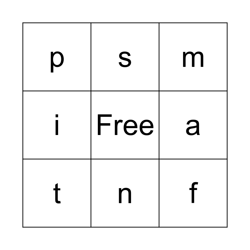 This bingo card has a free space and 8 words: a, m, s, t, p, f, i and n.