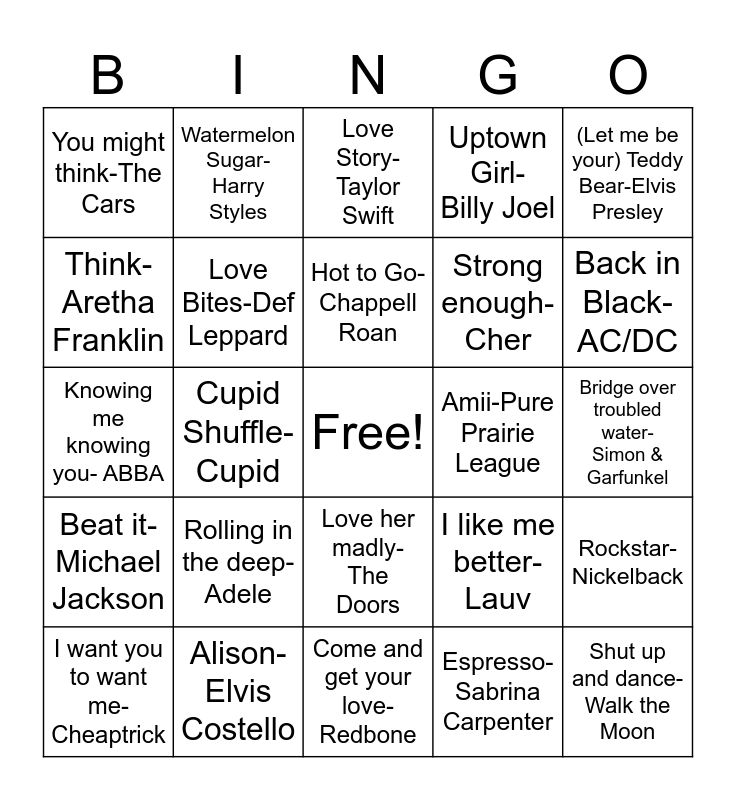 This bingo card has a free space and 42 words: Wrecking ball- Miley Cyrus, Hot to Go-Chappell Roan, Call me maybe-Carly Rae Jepson, Rolling in the deep-Adele, Espresso-Sabrina Carpenter, Rockstar-Nickelback, Shut up and dance- Walk the Moon, Layla- Derek & the Dominos, Love Story- Taylor Swift, Love her madly-The Doors, Bridge over troubled water- Simon & Garfunkel, Back in Black- AC/DC, Cupid Shuffle-Cupid, (Let me be your) Teddy Bear-Elvis Presley, Butter-BTS, I like me better-Lauv, Doctor My eyes- Joe Jackson, Knowing me knowing you- ABBA, Honky Cat- Elton John, Watermelon Sugar- Harry Styles, Think-Aretha Franklin, See you later Alligator- Bill Haley & The Comets, My Prerogative- Bobby Brown, You might think-The Cars, Personal Jesus- Depeche Mode, Shake it off- Taylor Swift, Strong enough- Cher, She bangs- Ricky Martin, Wrapped around your finger- The Police, So What- P!nk, Rock your Body- Justin Timberlake, Beat it-Michael Jackson, Love Bites-Def Leppard, Come and get your love- Redbone, Play that funky music- wild Cherry, I want you to want me- Cheaptrick, Alison-Elvis Costello, Amii-Pure Prairie League, Wake up little Susie- The Everly Brothers, I want it that way- Backstreet Boys, Uptown Girl- Billy Joel and The Power of love- Huey Lewis and the news.