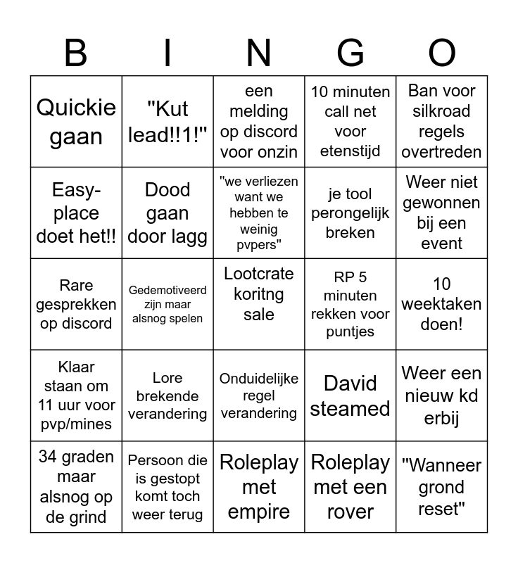 This bingo card has a free space and 24 words: Lore brekende verandering, Persoon die is gestopt komt toch weer terug, ''we verliezen want we hebben te weinig pvpers'', 34 graden maar alsnog op de grind, Ban voor silkroad regels overtreden, Quickie gaan, Easy-place doet het!!, ''Kut lead!!1!'', RP 5 minuten rekken voor puntjes, Onduidelijke regel verandering, je tool perongelijk breken, Rare gesprekken op discord, David steamed, Weer een nieuw kd erbij, Dood gaan door lagg, Roleplay met een rover, 10 weektaken doen!, een melding op discord voor onzin, Weer niet gewonnen bij een event, Gedemotiveerd zijn maar alsnog spelen, ''Wanneer grond reset'', Klaar staan om 11 uur voor pvp/mines, 10 minuten call net voor etenstijd and Roleplay met empire.