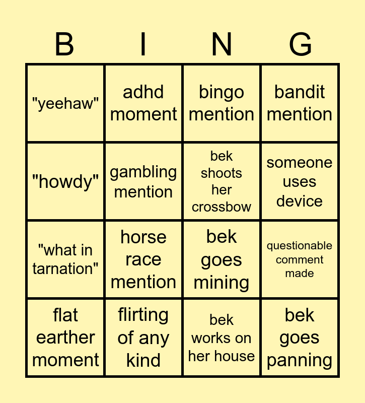 This bingo card has 16 words: flirting of any kind, questionable comment made, bingo mention, "yeehaw", "what in tarnation", adhd moment, bek goes mining, bek works on her house, "howdy", gambling mention, flat earther moment, bandit mention, horse race mention, someone uses device, bek shoots her crossbow and bek goes panning.
