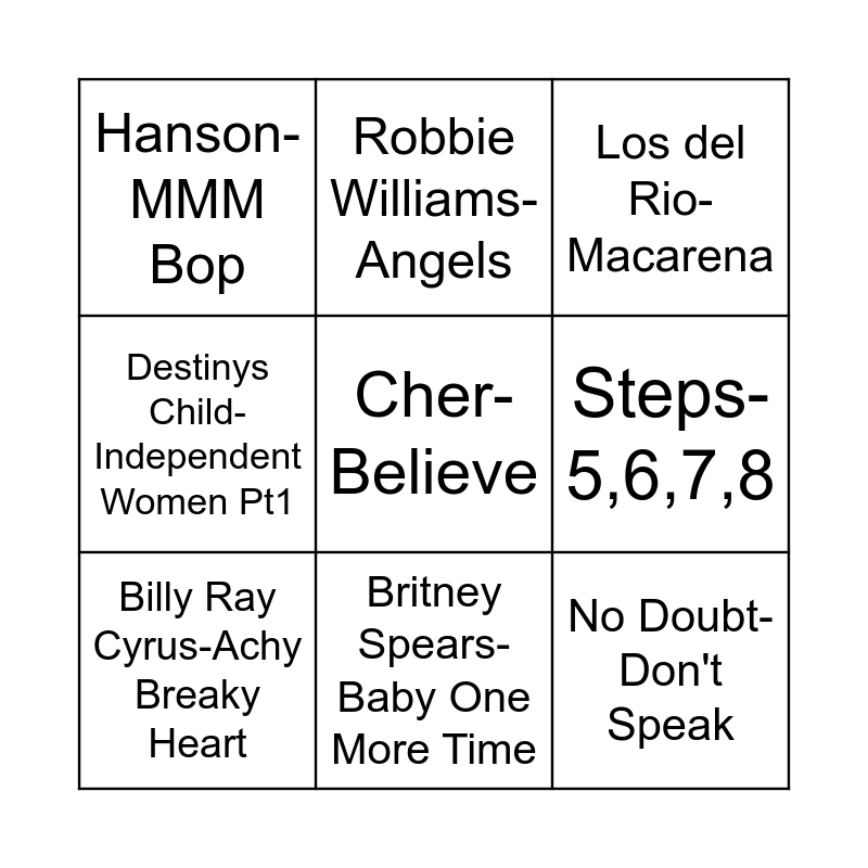 This bingo card has 41 words: Ace of Base-All that She Wants, Alanis Morrissette-Ironic, Anna Lee-2 Times, Billy Ray Cyrus-Achy Breaky Heart, Blur-Parklife, Boyzone-Picture of You, Britney Spears-Baby One More Time, B-Witched-C'est La Vie, Cher-Believe, Chesney Hawkes-The One and Only, Des'ree-Life, Destinys Child-Independent Women Pt1, Will Smith & DJ Jazzy Jeff-Boom Shake the Room, Eiffel 65-Blue (Da Ba Dee), Five-Everybody Get Up, Gala-Freed From Desire, Gina G-Ooh aah...Just a Little Bit, Hanson-MMM Bop, LeAnn Rimes-Can't fight the Moonlight, Los del Rio-Macarena, Lou Bega- Mambo No.5 (A Little Bit of.., MC Hammer-U Can't Touch This, Nirvana-Smells Like Teen Spirit, No Doubt-Don't Speak, Oasis-Wonderwall, Ocean Colour Scene- The Day We Caught The Train, Outhere Brothers-Boom Boom Boom, Peter Andre-Mysterious Girl, Radiohead-Creep, Rednex-Cotton Eyed Joe, Ricky Martin-Livin'la Vida Loca, Robbie Williams-Angels, S Club 7- Bring it All Back, Snap-Rhythm is a Dancer, Spice Girls-Stop, Steps-5,6,7,8, The Offspring-Pretty Fly (For a White Guy), The Rembrandts-I'll Be There For You, TLC-No Scrubs, Vengaboys-Boom, Boom, Boom, Boom! and Natalie Imbruglia-Torn.