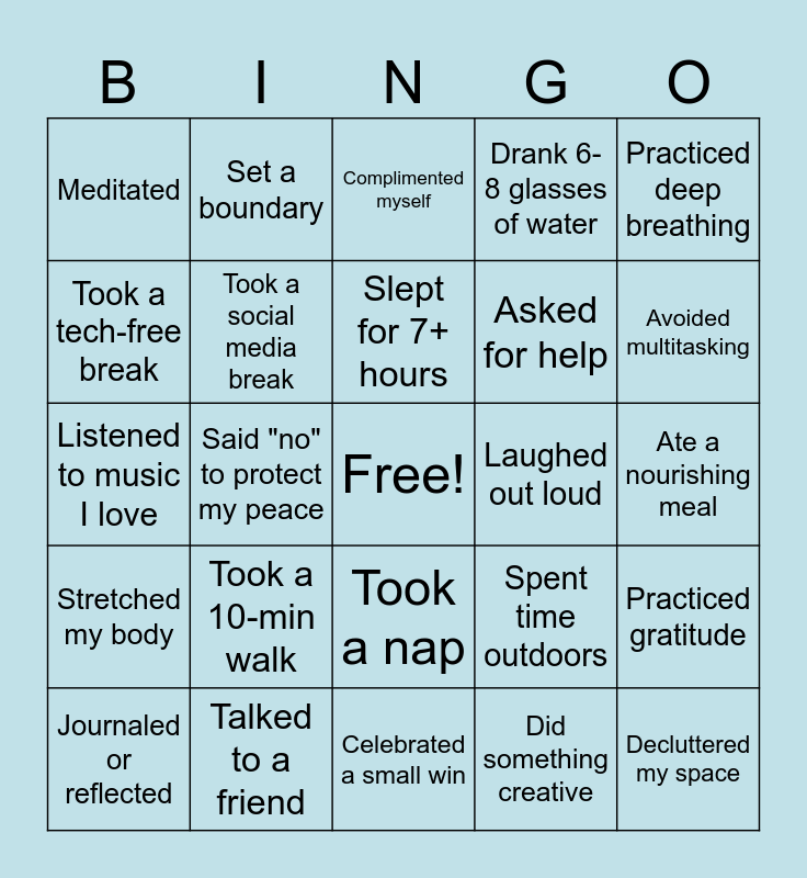 This bingo card has a free space and 24 words: Took a 10-min walk, Talked to a friend, Slept for 7+ hours, Journaled or reflected, Practiced deep breathing, Meditated, Took a tech-free break, Set a boundary, Laughed out loud, Took a nap, Asked for help, Listened to music I love, Spent time outdoors, Practiced gratitude, Took a social media break, Did something creative, Ate a nourishing meal, Complimented myself, Avoided multitasking, Said "no" to protect my peace, Decluttered my space, Stretched my body, Drank 6-8 glasses of water and Celebrated a small win.