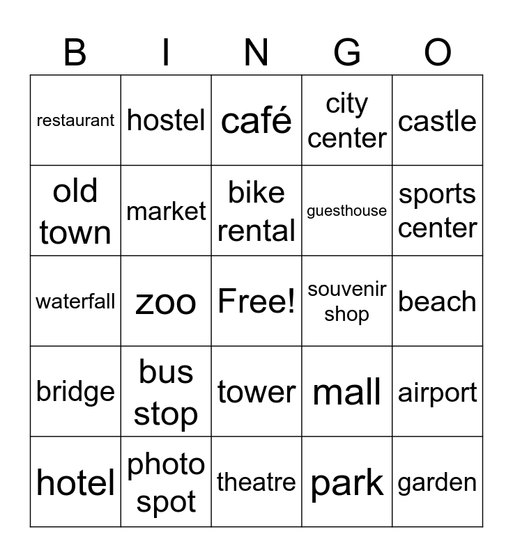 This bingo card has a free space and 31 words: theatre, cinema, zoo, museum, restaurant, café, market, mall, souvenir shop, park, beach, garden, swimming pool, stadium, sports center, train station, airport, bus stop, bridge, tower, castle, mosque, hotel, hostel, guesthouse, old town, city center, waterfall, photo spot, bike rental and Hospital.