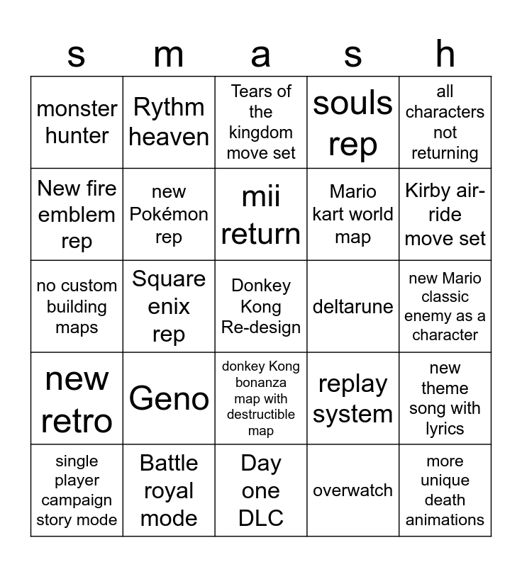 This bingo card has a free space and 24 words: Geno, Battle royal mode, mii return, single player campaign story mode, all characters not returning, monster hunter, New fire emblem rep, Rythm heaven, deltarune, donkey Kong bonanza map with destructible map, Mario kart world map, no custom building maps, replay system, new theme song with lyrics, new Pokémon rep, overwatch, new Mario classic enemy as a character, Tears of the kingdom move set, Kirby air-ride move set, Square enix rep, more unique death animations, new retro, souls rep and Day one DLC.