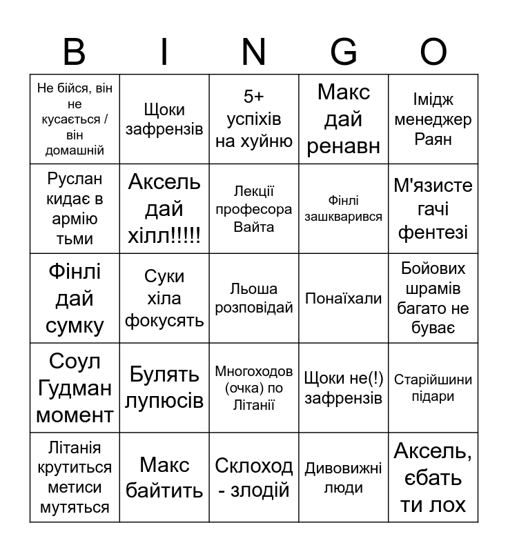 This bingo card has a free space and 24 words: Булять лупюсів, Макс байтить, Лекції професора Вайта, Літанія крутиться метиси мутяться, Імідж менеджер Раян, Не бійся, він не кусається / він домашній, Руслан кидає в армію тьми, Щоки зафрензів, Понаїхали, Многоходов (очка) по Літанії, Фінлі зашкварився, Фінлі дай сумку, Щоки не(!) зафрензів, Старійшини підари, Аксель дай хілл!!!!!, Дивовижні люди, Бойових шрамів багато не буває, 5+ успіхів на хуйню, М'язисте гачі фентезі, Суки хіла фокусять, Аксель, єбать ти лох, Соул Гудман момент, Макс дай ренавн and Склоход - злодій.