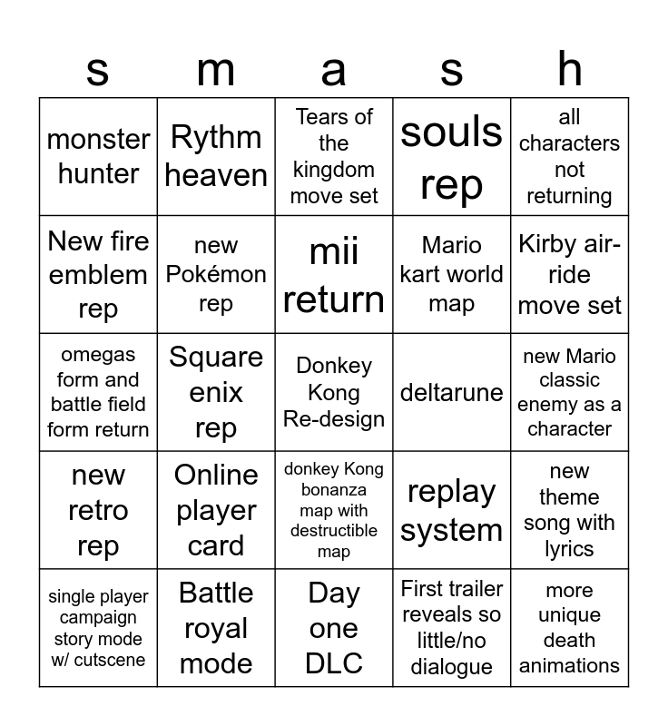 This bingo card has a free space and 24 words: Online player card, Battle royal mode, mii return, single player campaign story mode w/ cutscene, all characters not returning, monster hunter, New fire emblem rep, Rythm heaven, deltarune, donkey Kong bonanza map with destructible map, Mario kart world map, omegas form and battle field form return, replay system, new theme song with lyrics, new Pokémon rep, First trailer reveals so little/no dialogue, new Mario classic enemy as a character, Tears of the kingdom move set, Kirby air-ride move set, Square enix rep, more unique death animations, new retro rep, souls rep and Day one DLC.