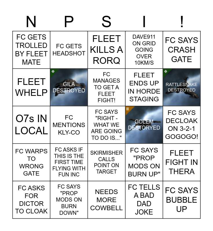 This bingo card has 7 images and 65 words: FC DISCONNECTS FROM GAME, FLEET GOES THROUGH THERA, FC ASKS FOR EWAR ON POD, FLEET FIGHT IN THERA, FC SAYS BEST SPEED TO DESTO, FC FAILS TO WARP FLEET, FC GETS HEADSHOT, FLEET GETS DROPPED BY A BLOPS GANG, FC MANAGES TO GET A FLEET FIGHT!, FLEET ENDS UP GATE RATTING, SKIRMISHER CALLS POINT ON TARGET, FC SAYS ALIGN SUN, FC SAYS DECLOAK ON 3-2-1 GOGOGO!, FC SAYS CRASH GATE, FC TRIES TO KILL A RORQ, FLEET WHELP, FC MENTIONS KLY-CO, FC GETS TROLLED BY FLEET MATE, FC TAKES BIO FOR MORE TEA, FLEET ENDS UP IN HORDE STAGING, FC ASKS IF THIS IS THE FIRST TIME FLYING WITH FUN INC, FC WARPS TO WRONG GATE, DAVE911 ON GRID GOING OVER 10KM/S, FC GOES WRONG WAY, FC CAN'T FIND A SYSTEM ON THE MAP, FLEET GETS CHASED BY OVERWHELMING RESPONSE FLEET, FC SAYS "TO BE FAIR", FC ASKS FOR A VOLUNTEER, FC SAYS "RIGHT - WHAT WE ARE GOING TO DO IS...", FC ASKS FOR LOGI AND GETS A RESPONSE FROM SOMEONE CALLED CHRIS, FC ASKS FOR DICTOR TO CLOAK, FC ASKS FOR SOMEONE TO CHECK ZKILL, FLEET GOES THROUGH TURNUR, REV BUBBLES A MINING FLEET, FC SAYS "PROP MODS ON BURN UP", FC SAYS "PROP MODS ON BURN DOWN", GFs IN LOCAL GFGF, O7s IN LOCAL, FC TELLS A BAD DAD JOKE, ISHTAR DESTROYED, GILA DESTROYED, VARGUR DESTROYED, GOLEM DESTORYED, KRONOS DESTROYED, PALADIN DESTROYED, FC DONE GOOFED!, RATTLESNAKE DESTROYED, FC SAYS "OOOH SHUTTLE!", FC SAYS BUBBLE UP, FC SAYS KILL THE TENGU, FC CALLS FOR A BUBBLE AND GETS TWO, MEMRAN EATS ICE CREAM, FC TOOTS HIS HORN, NEEDS MORE COWBELL, SOMEONE MENTIONS REYKJAVIK FACEPLANT, FLEET TAKES OBVIOUS BAIT, POD DIES TO HEAVY EWAR, FLEET KILLS A RORQ, ZIVA SUICIDE SCRAMS A TARGET, FLEET DOES A DOUBLE BOOSH, FLEET GETS PIPE BOMBED, FIDEL HOLDS A TARGET FOR FIVE MINUTES WHILST FLEET BENNY HILLS ABOUT, FC USES ALL CORRECT PHONETIC ALPHABET WORDS WHEN REFERRING TO A SYSTEM, FLEET BUMPS SOMEONE OFF TETHER AND KILLS THEM and FLEET GOES THROUGH POCHVEN.