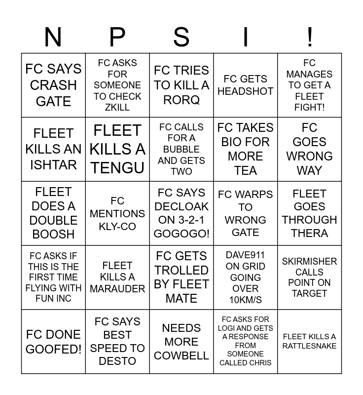 This bingo card has a free space and 69 words: FC DISCONNECTS FROM GAME, FLEET GOES THROUGH THERA, FC ASKS FOR EWAR ON POD, FLEET FIGHT IN THERA, FC SAYS BEST SPEED TO DESTO, FC FAILS TO WARP FLEET, FC GETS HEADSHOT, FLEET GETS DROPPED BY A BLOPS GANG, FC MANAGES TO GET A FLEET FIGHT!, FLEET ENDS UP GATE RATTING, SKIRMISHER CALLS POINT ON TARGET, FC SAYS ALIGN SUN, FC SAYS CRASH GATE, FC TRIES TO KILL A RORQ, FLEET WHELP, FC MENTIONS KLY-CO, FC GETS TROLLED BY FLEET MATE, FC TAKES BIO FOR MORE TEA, FLEET ENDS UP IN HORDE STAGING, FC ASKS IF THIS IS THE FIRST TIME FLYING WITH FUN INC, FC WARPS TO WRONG GATE, DAVE911 ON GRID GOING OVER 10KM/S, FC GOES WRONG WAY, FC CAN'T FIND A SYSTEM ON THE MAP, FLEET GETS CHASED BY OVERWHELMING RESPONSE FLEET, FC SAYS "TO BE FAIR", FC ASKS FOR A VOLUNTEER, FC SAYS "RIGHT - WHAT WE ARE GOING TO DO IS...", FC ASKS FOR LOGI AND GETS A RESPONSE FROM SOMEONE CALLED CHRIS, FC ASKS FOR DICTOR TO CLOAK, FC ASKS FOR SOMEONE TO CHECK ZKILL, FLEET GOES THROUGH TURNUR, REV BUBBLES A MINING FLEET, FC SAYS "PROP MODS ON BURN UP", FC SAYS "PROP MODS ON BURN DOWN", GFs IN LOCAL GFGF, o7s IN LOCAL, FC TELLS A BAD DAD JOKE, FLEET KILLS AN ISHTAR, FLEET KILLS A GILA, FLEET KILLS A MARAUDER, FLEET KILLS A RATTLESNAKE, FLEET KILLS A DREAD, FLEET KILLS A TITAN, FLEET KILLS A CARRIER, FC DONE GOOFED!, FC SAYS "OOOH SHUTTLE!", FC SAYS "BUBBLE UP", FC SAYS KILL THE TENGU, FLEET KILLS A TENGU, FC CALLS FOR A BUBBLE AND GETS TWO, MEMRAN EATS ICE CREAM, FC TOOTS HIS HORN, NEEDS MORE COWBELL, SOMEONE MENTIONS REYKJAVIK FACEPLANT, FLEET TAKES OBVIOUS BAIT, POD DIES TO HEAVY EWAR, FLEET KILLS A RORQ, ZIVA SUICIDE SCRAMS A TARGET, FLEET DOES A DOUBLE BOOSH, FLEET GETS PIPE BOMBED, FIDEL HOLDS A TARGET FOR FIVE MINUTES WHILST FLEET BENNY HILLS ABOUT, FC USES ALL CORRECT PHONETIC ALPHABET WORDS WHEN REFERRING TO A SYSTEM, FLEET BUMPS SOMEONE OFF TETHER AND KILLS THEM, FLEET KILLS A FALCON, SOMEONE GETS THEIR FIRST EVER KILLMAIL, FLEET GOES THROUGH POCHVEN, FLEET TRIES TO KILL A MONITOR and FLEET KILLS MULTIPLE BARGES IN THE SAME ENGAGEMENT.