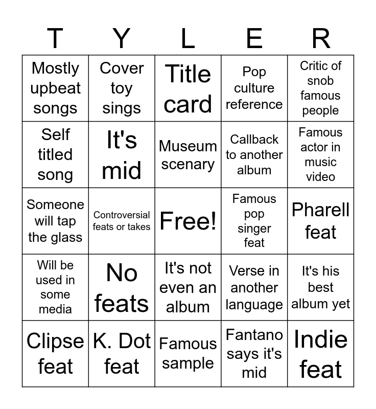 This bingo card has a free space and 24 words: No feats, K. Dot feat, Museum scenary, Clipse feat, Critic of snob famous people, Mostly upbeat songs, Self titled song, Cover toy sings, Famous pop singer feat, It's not even an album, Callback to another album, Someone will tap the glass, Verse in another language, It's his best album yet, It's mid, Fantano says it's mid, Pharell feat, Title card, Famous actor in music video, Controversial feats or takes, Indie feat, Will be used in some media, Pop culture reference and Famous sample.