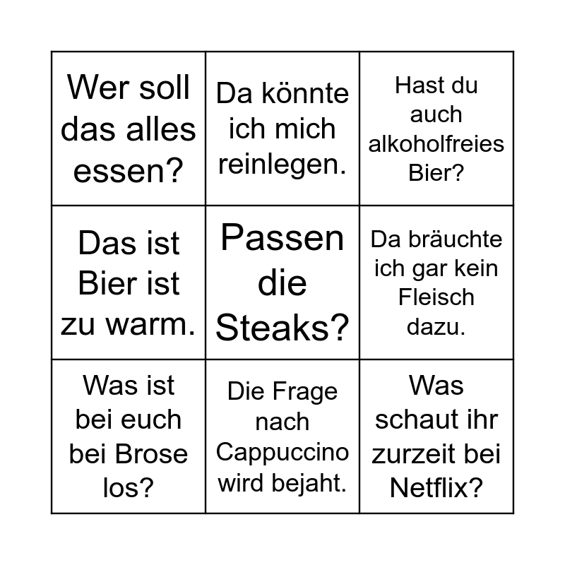 This bingo card has 9 words: Was ist bei euch bei Brose los?, Passen die Steaks?, Hast du auch alkoholfreies Bier?, Wer soll das alles essen?, Da könnte ich mich reinlegen., Da bräuchte ich gar kein Fleisch dazu., Das ist Bier ist zu warm., Die Frage nach Cappuccino wird bejaht. and Was schaut ihr zurzeit bei Netflix?.