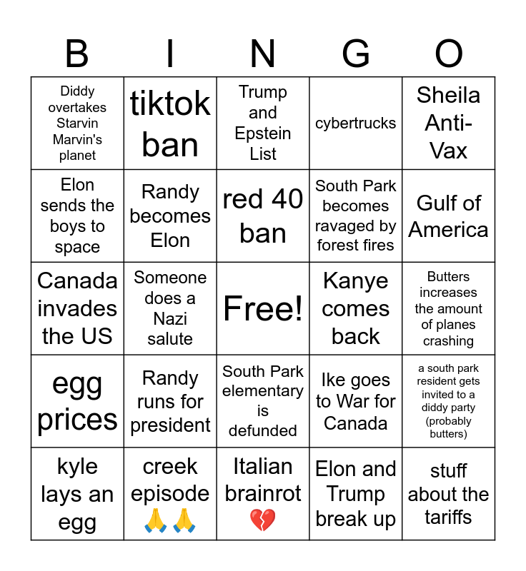 This bingo card has a free space and 24 words: Randy runs for president, creek episode 🙏🙏, red 40 ban, kyle lays an egg, Sheila Anti-Vax, Diddy overtakes Starvin Marvin's planet, Elon sends the boys to space, tiktok ban, Kanye comes back, South Park elementary is defunded, South Park becomes ravaged by forest fires, Canada invades the US, Ike goes to War for Canada, a south park resident gets invited to a diddy party (probably butters), Randy becomes Elon, Elon and Trump break up, Butters increases the amount of planes crashing, Trump and Epstein List, Gulf of America, Someone does a Nazi salute, stuff about the tariffs, egg prices, cybertrucks and Italian brainrot 💔.