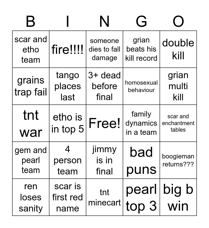 This bingo card has a free space and 24 words: 4 person team, scar is first red name, 3+ dead before final, ren loses sanity, double kill, scar and etho team, grains trap fail, fire!!!!, family dynamics in a team, jimmy is in final, homosexual behaviour, tnt war, bad puns, boogieman returns???, tango places last, pearl top 3, scar and enchantment tables, someone dies to fall damage, grian multi kill, etho is in top 5, big b win, gem and pearl team, grian beats his kill record and tnt minecart.
