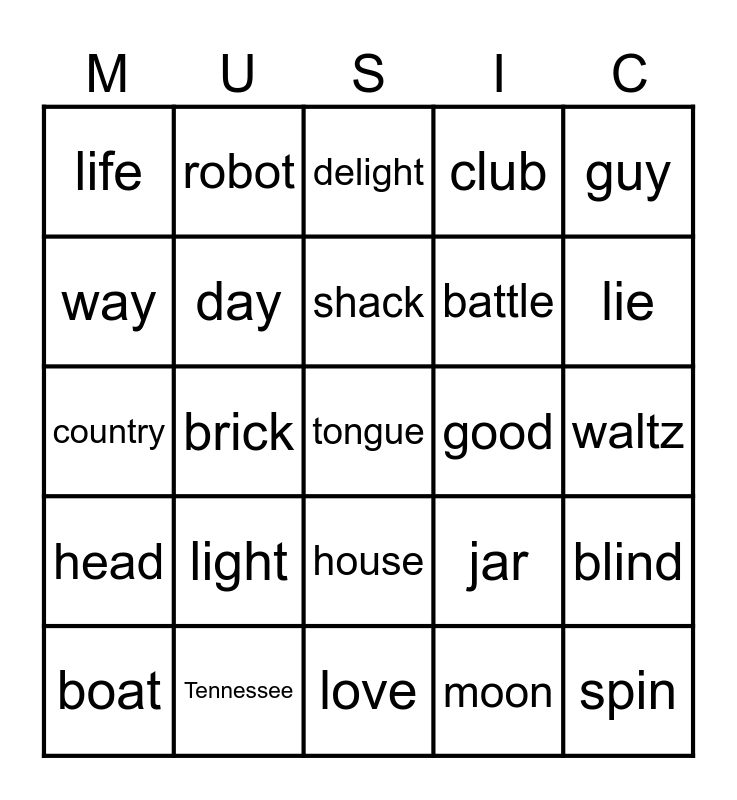 This bingo card has 37 words: bad, banana, bar, battle, blind, boat, brick, carry, club, company, country, day, tongue, good, guy, head, home, delight, jar, lie, life, light, house, moon, pink, road, robot, love, song, spin, sun, Tennessee, shack, wall, waltz, way and whiskey.