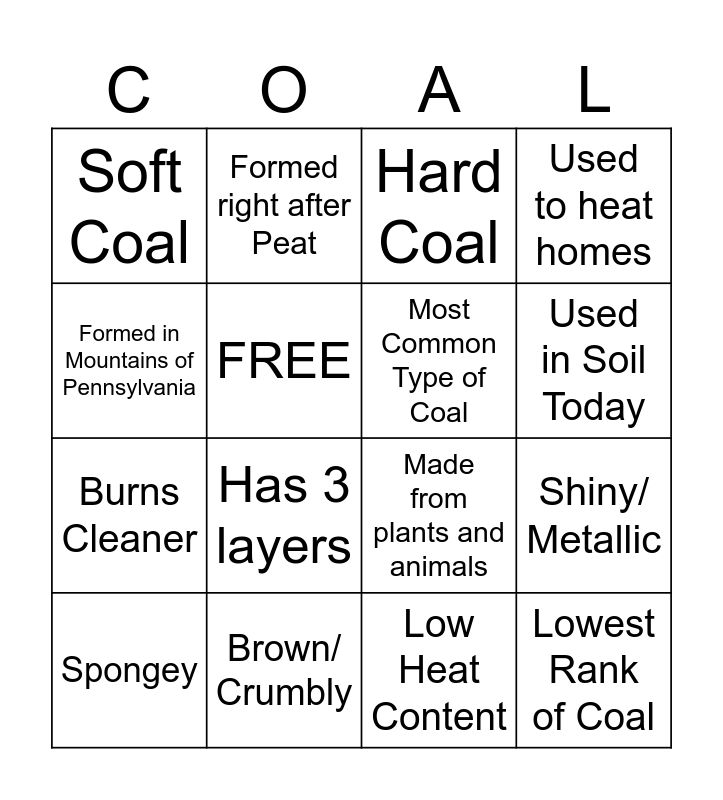 This bingo card has 16 words: Brown/ Crumbly, Shiny/ Metallic, Hard Coal, Soft Coal, Burns Cleaner, Formed right after Peat, Made from plants and animals, Low Heat Content, Formed in Mountains of Pennsylvania, FREE, Spongey, Used to heat homes, Has 3 layers, Used in Soil Today, Most Common Type of Coal and Lowest Rank of Coal.