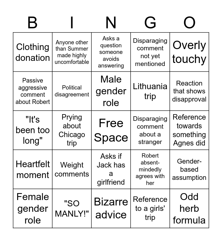 This bingo card has a free space and 24 words: Weight comments, "SO MANLY!", Male gender role, Female gender role, Overly touchy, Clothing donation, Passive aggressive comment about Robert, Anyone other than Summer made highly uncomfortable, Disparaging comment about a stranger, Asks if Jack has a girlfriend, Lithuania trip, "It's been too long", Robert absent-mindedly agrees with her, Gender-based assumption, Political disagreement, Reference to a girls' trip, Reference towards something Agnes did, Asks a question someone avoids answering, Reaction that shows disapproval, Prying about Chicago trip, Odd herb formula, Heartfelt moment, Disparaging comment not yet mentioned and Bizarre advice.