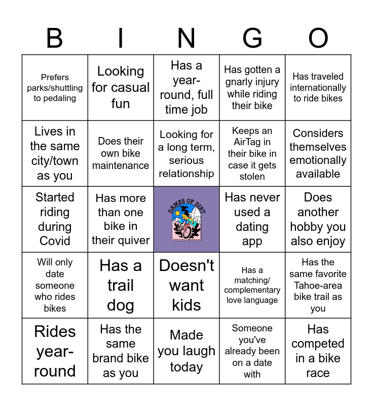 This bingo card has a free space and 24 words: Has a trail dog, Has the same brand bike as you, Looking for a long term, serious relationship, Rides year-round, Has traveled internationally to ride bikes, Prefers parks/shuttling to pedaling, Lives in the same city/town as you, Looking for casual fun, Has never used a dating app, Doesn't want kids, Keeps an AirTag in their bike in case it gets stolen, Started riding during Covid, Has a matching/ complementary love language, Has the same favorite Tahoe-area bike trail as you, Does their own bike maintenance, Someone you've already been on a date with, Does another hobby you also enjoy, Has a year-round, full time job, Considers themselves emotionally available, Has more than one bike in their quiver, Has competed in a bike race, Will only date someone who rides bikes, Has gotten a gnarly injury while riding their bike and Made you laugh today.