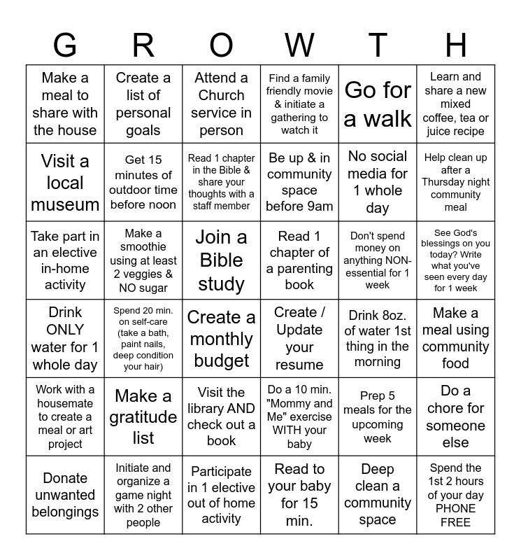 This bingo card has 36 words: Do a 10 min. "Mommy and Me" exercise WITH your baby, Visit the library AND check out a book, Read to your baby for 15 min., Visit a local museum, Drink ONLY water for 1 whole day, Read 1 chapter of a parenting book, Get 15 minutes of outdoor time before noon, Participate in 1 elective out of home activity, Go for a walk, Prep 5 meals for the upcoming week, Help clean up after a Thursday night community meal, Find a family friendly movie & initiate a gathering to watch it, Do a chore for someone else, Make a smoothie using at least 2 veggies & NO sugar, Be up & in community space before 9am, Make a meal to share with the house, Work with a housemate to create a meal or art project, Don't spend money on anything NON-essential for 1 week, Take part in an elective in-home activity, Attend a Church service in person, Join a Bible study, Spend 20 min. on self-care (take a bath, paint nails, deep condition your hair), Create / Update your resume, Create a monthly budget, Drink 8oz. of water 1st thing in the morning, Create a list of personal goals, No social media for 1 whole day, Initiate and organize a game night with 2 other people, Read 1 chapter in the Bible & share your thoughts with a staff member, Learn and share a new mixed coffee, tea or juice recipe, Spend the 1st 2 hours of your day PHONE FREE, Donate unwanted belongings, Make a meal using community food, See God's blessings on you today? Write what you've seen every day for 1 week, Make a gratitude list and Deep clean a community space.
