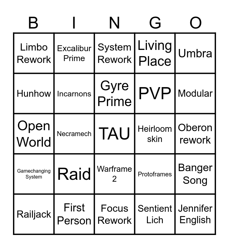 This bingo card has a free space and 24 words: Raid, First Person, Gyre Prime, Railjack, Umbra, Limbo Rework, Hunhow, Excalibur Prime, Heirloom skin, Warframe 2, PVP, Open World, Protoframes, Banger Song, Incarnons, Sentient Lich, Oberon rework, System Rework, Modular, Necramech, Jennifer English, Gamechanging System, Living Place and Focus Rework.