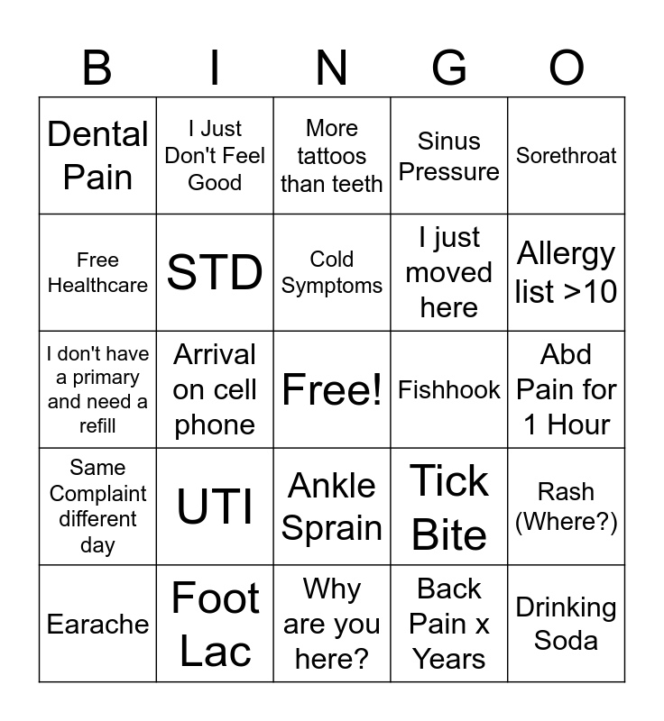 This bingo card has a free space and 24 words: UTI, Foot Lac, Cold Symptoms, Earache, Sorethroat, Dental Pain, Free Healthcare, I Just Don't Feel Good, Fishhook, Ankle Sprain, I just moved here, I don't have a primary and need a refill, Tick Bite, Rash (Where?), STD, Back Pain x Years, Abd Pain for 1 Hour, More tattoos than teeth, Allergy list >10, Arrival on cell phone, Drinking Soda, Same Complaint different day, Sinus Pressure and Why are you here?.