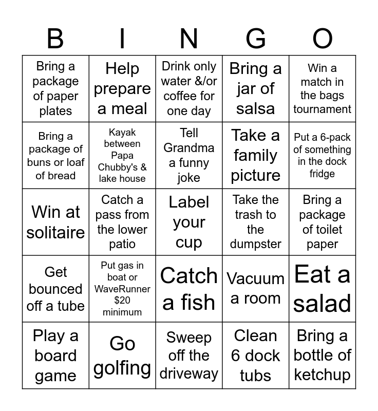 This bingo card has a free space and 34 words: Visit a cave, Clean 6 dock tubs, Run/walk between Papa Chubby's & lake house, Water ski, Get bounced off a tube, Kayak between Papa Chubby's & lake house, Win a match in the bags tournament, Play a board game, Help prepare a meal, Help clean up a meal, Tell Grandma a funny joke, Drink only water &/or coffee for one day, Go one day without eating tortilla chips, Write down a favorite memory of Grandpa, Take the trash to the dumpster, Put a 6-pack of something in the dock fridge, Go golfing, Win at solitaire, Put gas in boat or WaveRunner $20 minimum, Vacuum a room, Catch a fish, Tread water for one minute, Bring a package of paper plates, Bring a package of toilet paper, Sweep off the driveway, Bring a bottle of ketchup, Bring a jar of salsa, Bring a bag of chips, Take a family picture, Bring a package of buns or loaf of bread, Somersault off the dock or high dive, Catch a pass from the lower patio, Eat a salad and Bring a package of tortillas.