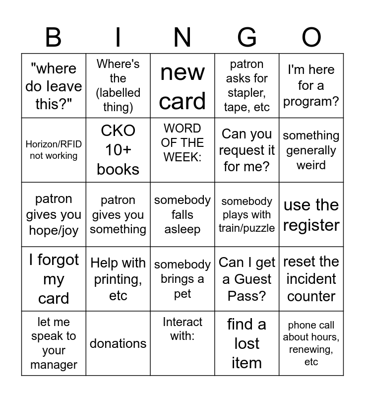 This bingo card has 25 words: Help with printing, etc, Interact with:, WORD OF THE WEEK:, let me speak to your manager, I'm here for a program?, "where do Ieave this?", Horizon/RFID not working, Where's the (labelled thing), somebody plays with train/puzzle, somebody brings a pet, Can you request it for me?, patron gives you hope/joy, Can I get a Guest Pass?, reset the incident counter, CKO 10+ books, phone call about hours, renewing, etc, use the register, new card, something generally weird, patron gives you something, somebody falls asleep, donations, I forgot my card, patron asks for stapler, tape, etc and find a lost item.