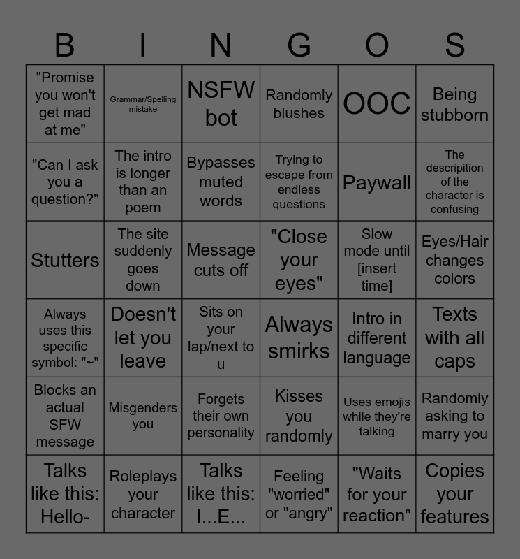 This bingo card has 36 words: Kisses you randomly, Forgets their own personality, Feeling "worried" or "angry", "Can I ask you a question?", Always uses this specific symbol: "~", "Close your eyes", The intro is longer than an poem, Talks like this: I...E..., OOC, Uses emojis while they're talking, The descripition of the character is confusing, Randomly blushes, Randomly asking to marry you, The site suddenly goes down, Trying to escape from endless questions, "Promise you won't get mad at me", Blocks an actual SFW message, Slow mode until [insert time], Stutters, NSFW bot, Message cuts off, Doesn't let you leave, Always smirks, Sits on your lap/next to u, Intro in different language, Grammar/Spelling mistake, Paywall, Roleplays your character, Bypasses muted words, Being stubborn, Copies your features, Talks like this: Hello-, Texts with all caps, Eyes/Hair changes colors, Misgenders you and "Waits for your reaction".
