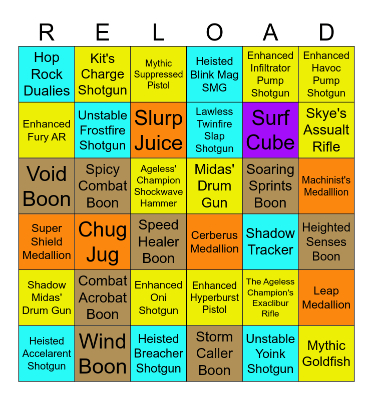 This bingo card has 54 words: Lawless Trinity AR, Midas' Drum Gun, Enhanced Spire Rifle, Combat Acrobat Boon, Machinist's Medalllion, Mythic Goldfish, Heisted Blink Mag SMG, Heisted Run N' Gun SMG, Enhanced Havoc Pump Shotgun, Enhanced Outlaw Shotgun, Hop Rock Dualies, Storm Caller Boon, Cerberus Medallion, Speed Healer Boon, Lawless Rift Launcher, Shadow Tracker, Void Boon, Slurp Juice, Enhanced Sentinel Pump Shotgun, Ageless' Champion Shockwave Hammer, Super Shield Medallion, Enhanced Oni Shotgun, Spicy Combat Boon, Enhanced Infiltrator Pump Shotgun, Shogun X Medallion, Kit's Charge Shotgun, Heisted Accelarent Shotgun, Jules' Drum Gun, Enhanced Hyperburst Pistol, Heighted Senses Boon, Gold Rush Boon, Heisted Breacher Shotgun, Adrenaline Rush Boon, Bass Boost, Mythic Suppressed Pistol, Unstable Yoink Shotgun, Surf Cube, Chug Jug, Shadow Midas' Drum Gun, Enhanced Fury AR, Enhanced Collateral Damage AR, Meowscole's Peow Peow Rifle, Shockwave Hammer, Lawless Explosive Mammoth Pistol, Soaring Sprints Boon, Enhanced Surgefire SMG, Wind Boon, The Ageless Champion's Exaclibur Rifle, Unstable Frostfire Shotgun, Skye's Assualt Rifle, Lawless Twinfire Slap Shotgun, Victory Crown, Leap Medallion and Legendary Sentinel Pump Shotgun.