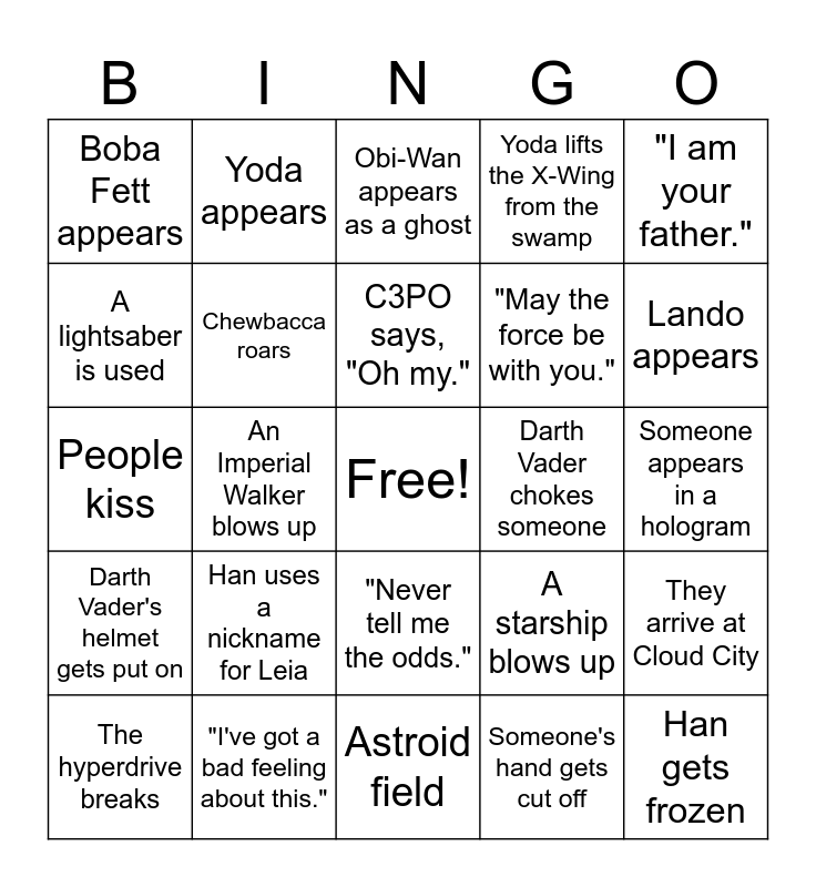 This bingo card has a free space and 24 words: Han uses a nickname for Leia, "I've got a bad feeling about this.", C3PO says, "Oh my.", The hyperdrive breaks, "I am your father.", Boba Fett appears, A lightsaber is used, Yoda appears, Darth Vader chokes someone, "Never tell me the odds.", "May the force be with you.", People kiss, A starship blows up, They arrive at Cloud City, Chewbacca roars, Someone's hand gets cut off, Someone appears in a hologram, Obi-Wan appears as a ghost, Lando appears, An Imperial Walker blows up, Han gets frozen, Darth Vader's helmet gets put on, Yoda lifts the X-Wing from the swamp and Astroid field.